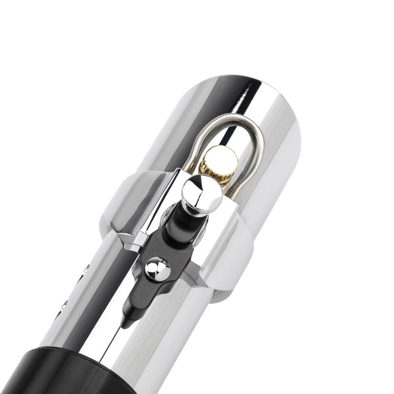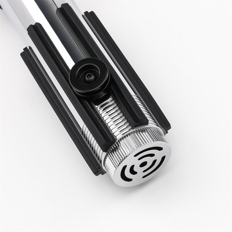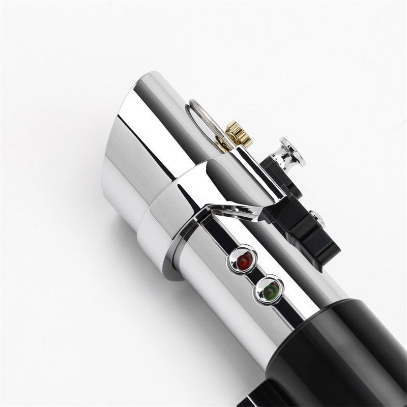 The hilt features a polished chrome finish with a robust black polymer handle grip. The screen accurate design includes the red and green buttons, as well as the 'D' ring as seen in Star Wars Attack of the Clones. Also included is a covertec wheel for easy attachment to your jedi belt when paired with a covertec clip.