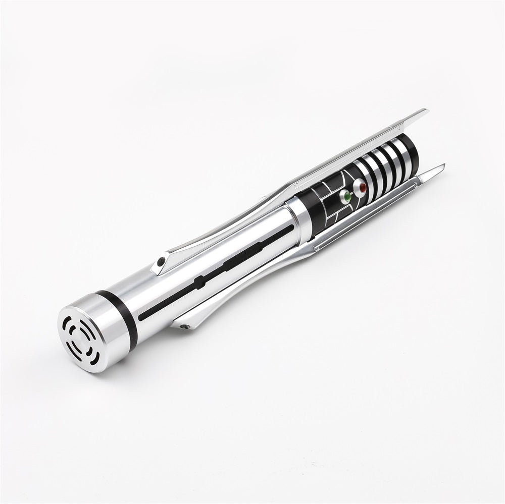 The hilt features a smooth silver finish with Revan's iconic three-spoke design. The upper handle has screen accurate ribbing and detailing, with red and green ignition buttons. It's finished off with a covertec wheel for assembling your lightsaber to your belt using a covertec clip.