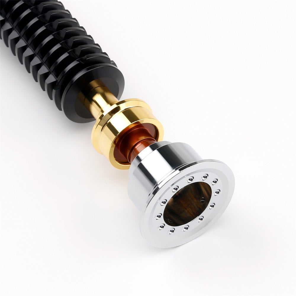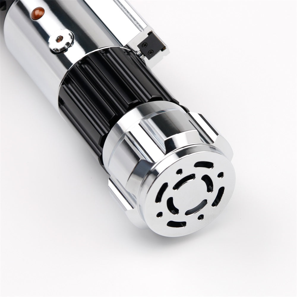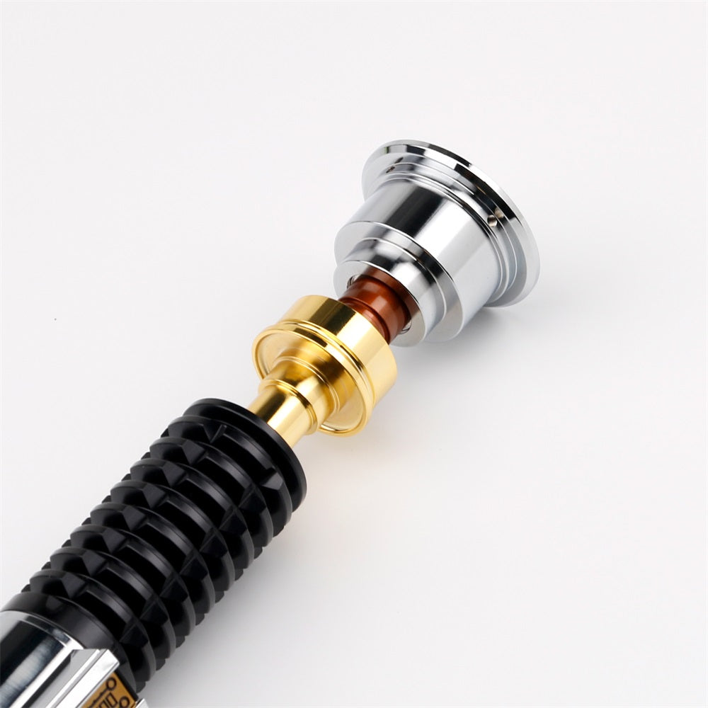 The hilt features a polished chrome emitter and pommel, with a delicate but sturdy copper and brass finish at the neck of the lightsaber. It also features a covertec wheel for easy attachment to your jedi belt when paired with a covertec clip.