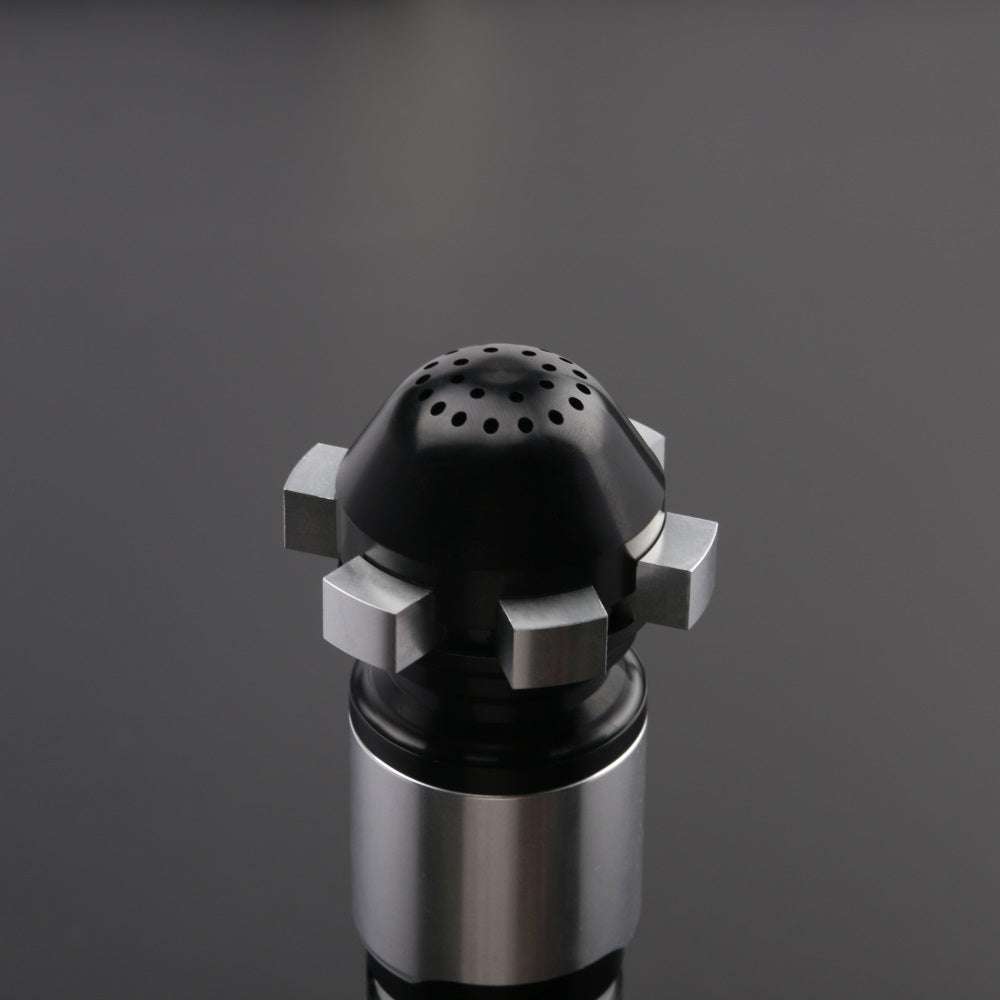 The hilt features a brushed silver finish, with a screen accurate black ribbed handle, screws and emitter, as used by Obi-Wan Kenobi in EP1 the Phantom Menace. The pommel has a large eight-spoke design with a covertec wheel attached for assembling your lightsaber to your belt using a covertec clip.