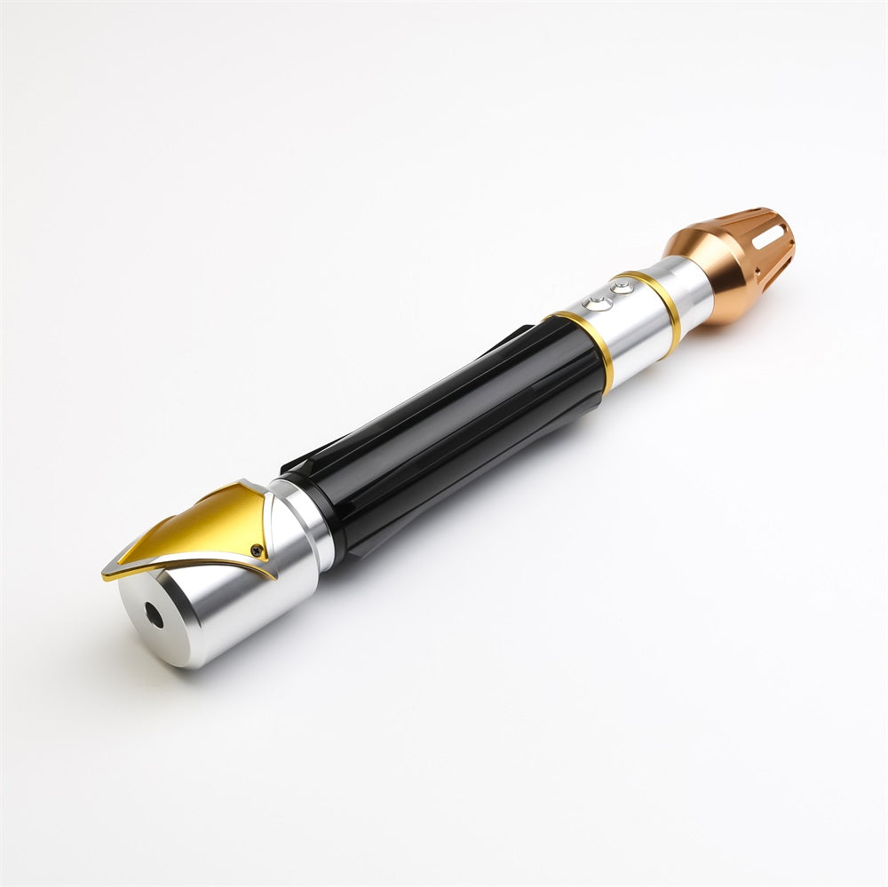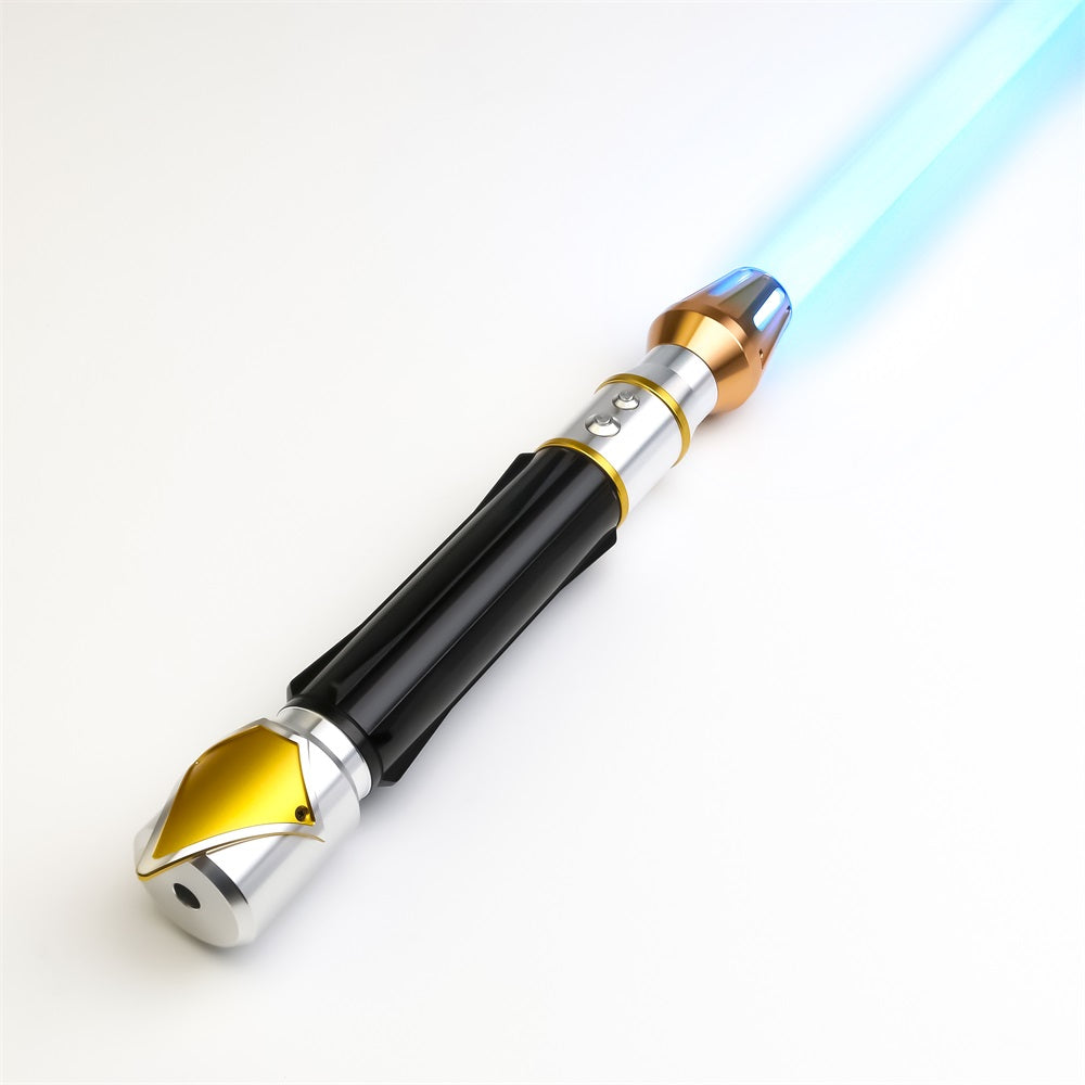 The hilt features a curved black ribbed handle for a firm grip. The upper body boasts a smooth silver design with two gold ring accents. The pommel also has a smooth silver design, with a distinct gold arrow-like plate. Finally the emitter consists of a brass finish with large incision gaps, revealing the blades powerful light from within.