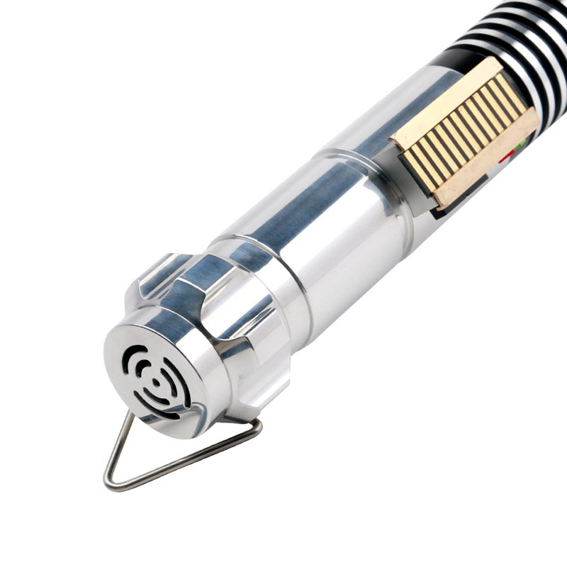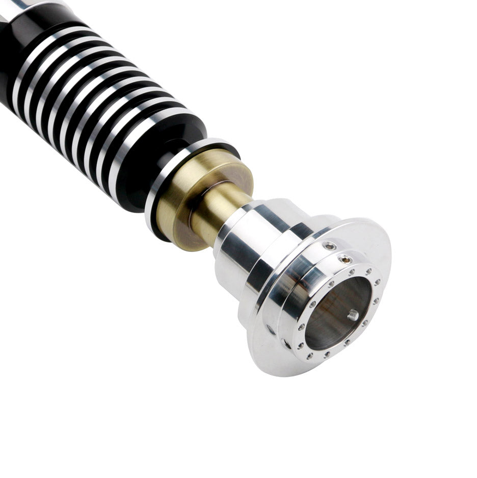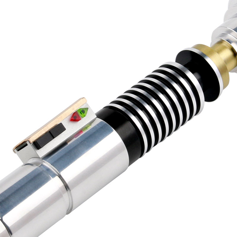 The hilt consists of a polished chrome finish with a sturdy copper neck. It features an activation box with red and green arrows as seen in EP6 Return of the Jedi. Finally, it's fitted with a triangle ring, perfect for assembling your lightsaber to your jedi belt.